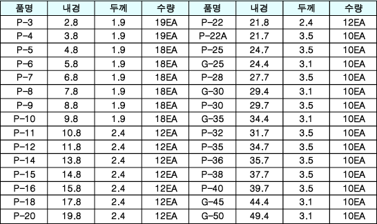 ¡á ÀçÁú : ÀϹݿë(NBR-70), °í¾Ð¿ë(NBR-90), ÁÖ¹®»ç¾ç(VITON-70, SILICONE-60)
